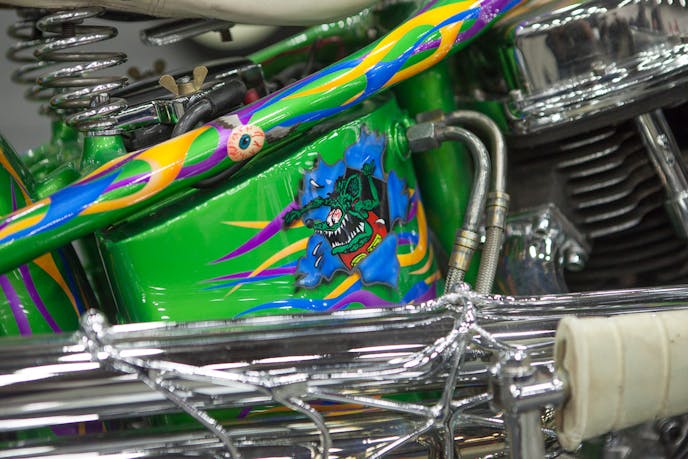 The flame work that covers nearly every square inch of the frame is detailed and intricate. The right side of the bike features a stylized Rat fink that bursts through the flames.
