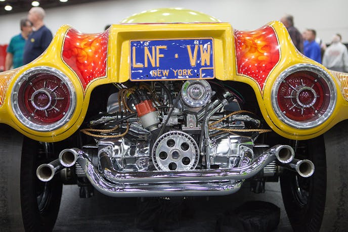 Now rebuilt and completely polished, the engine sits at the tail end of a custom frame built of box steel and round tube. At the opposite end, positioned well ahead of the cockpit, is a Super Bell drop axle that has Harley Davidson motorcycle wheels mounted on each end.
