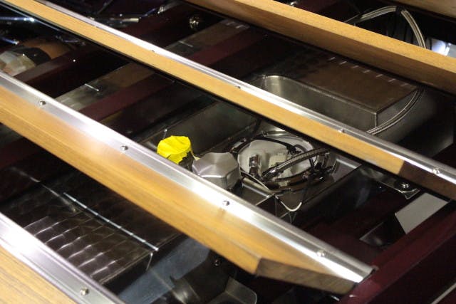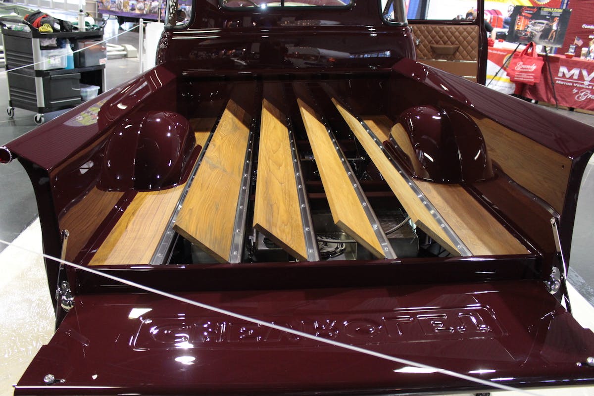 A pickup is nothing without a bed, and the bed in this Chevy is as unique and one-of-a-kind as they come. The bed itself is raised, along with the running boards. Obviously the bed floor is raised in tandem with the bed sides. Simms extended the front of the top bed rails, extending the front stake pockets to the running boards and connected the stake pockets to the top bed rail. The bed features wood bed boards that articulate by electric control. A function that is probably pretty handy when servicing the A/C condenser and fan that is mounted under the bed floor.