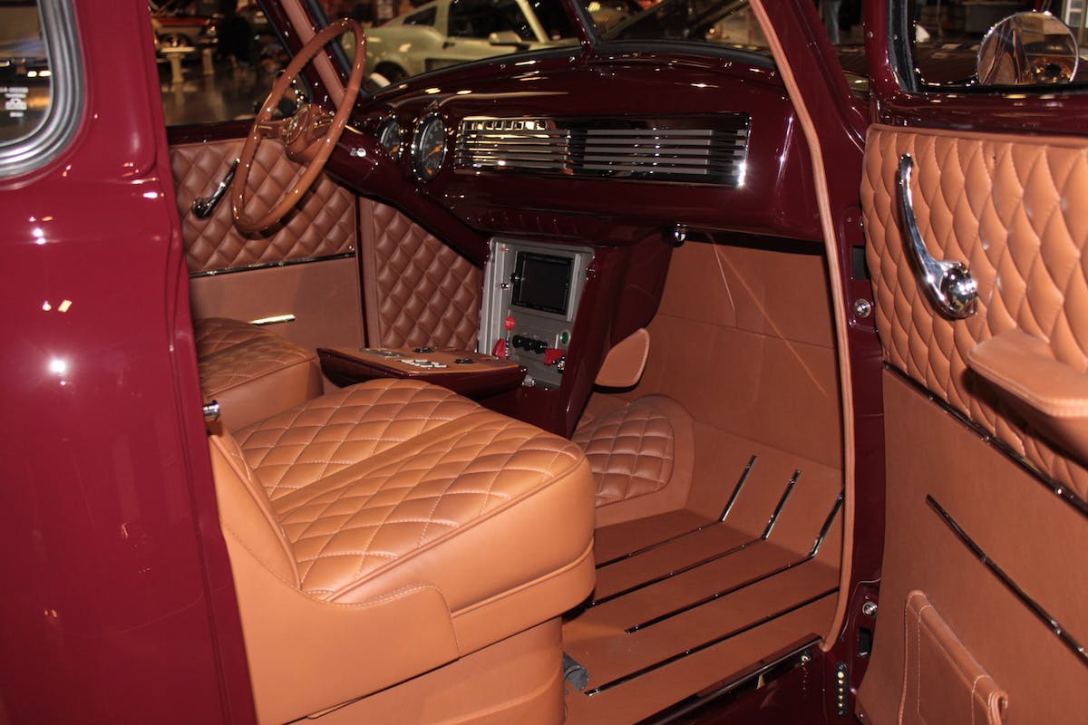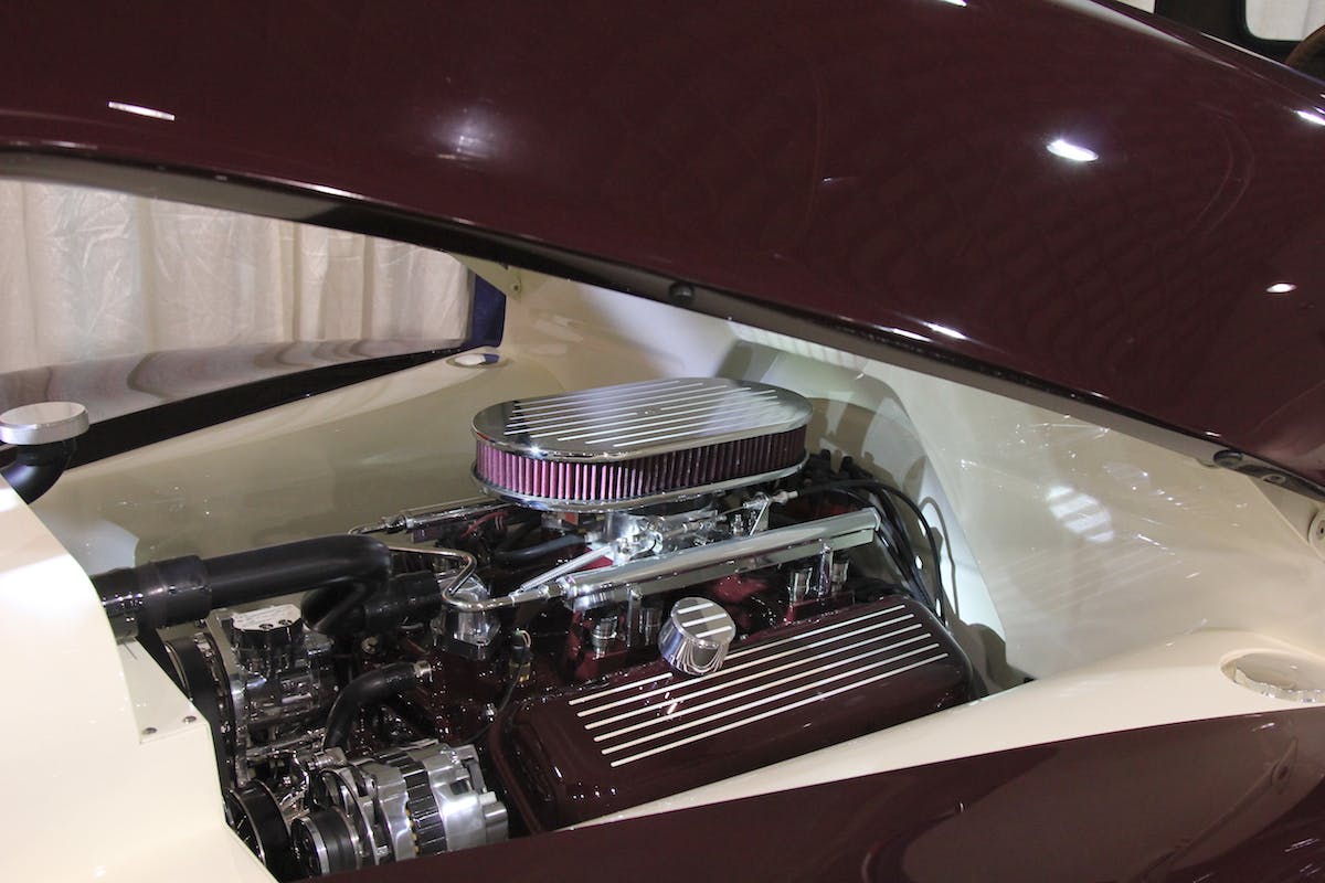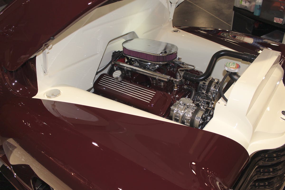 Painted in a vivid Burgundy by Darryl Hollenbeck of the prominent Vintage Color Studio, the reddish-brown truck accents the rich exterior color with cream colored wheels and underhood area. A 500 horsepower fuel injected big-block Chevy rests in the creamy engine bay that features a custom radiator cover and fan shroud. With the hood open, custom built front inner fenders with hidden hardware is exposed to those that pay close attention to details.