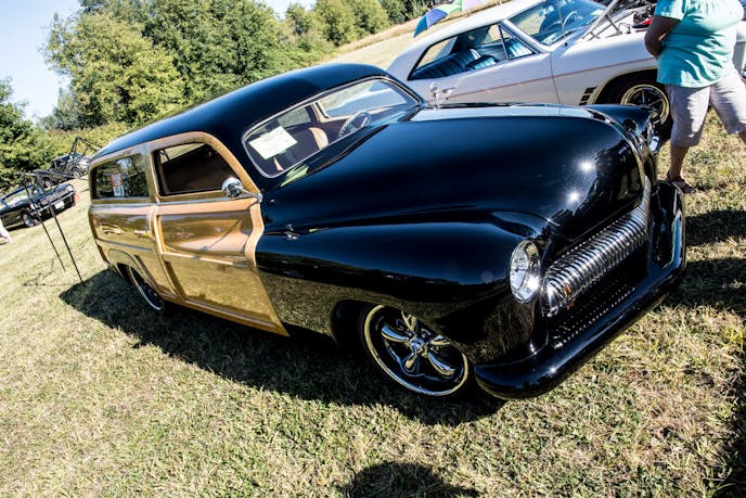 The hood mechanism is another thing that we thought was pretty interesting. He used the struts off of an old caprice for the hydraulic cylinders. That heavy hood needed some extra lifting power to keep it open. He also placed the rear-view mirrors on the metal of the hood, rather than the wood of the window frame or door post. A stellar choice that keeps the wood clean and smooth and adds another custom touch to his already over-the-top Mercury build.