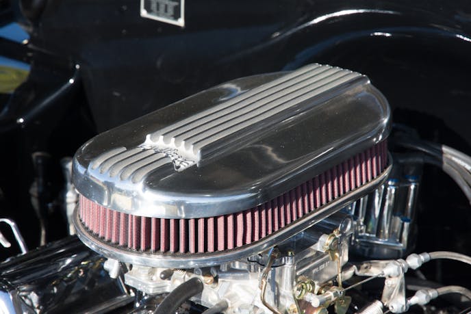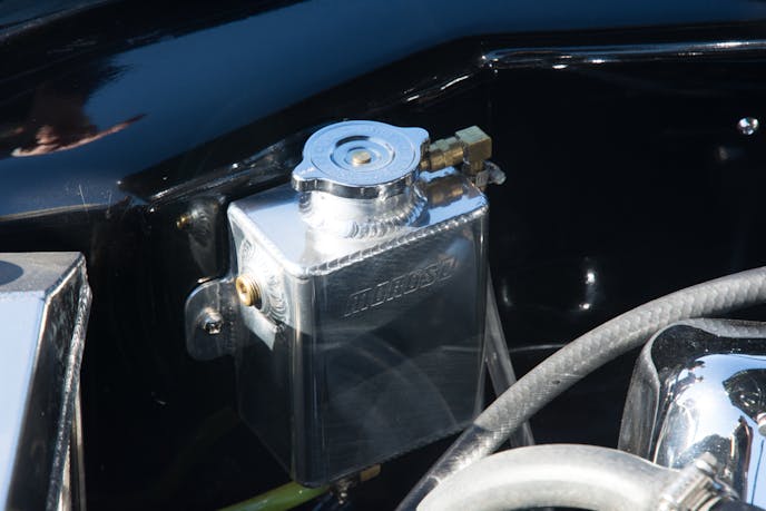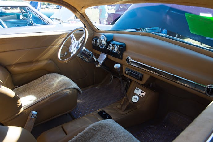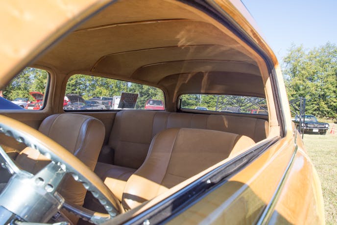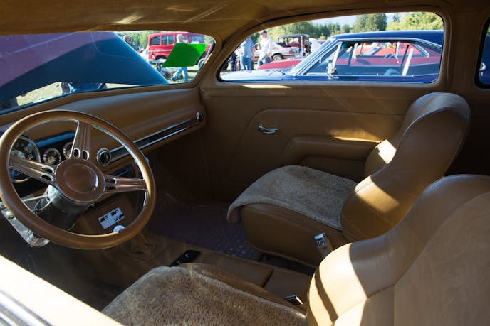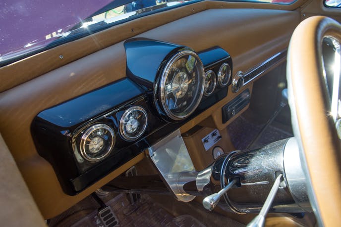 The interior is just as well-crafted as the exterior and features leather and suede upholstery, Classic Instruments gauges, and an ididit steering column. The seatbelts are another addition by Rich. We just love the styling of the interior and the way the black instrument cluster stands out against the tan dash. The custom console with the floor shifter is also an awesome feature, and the Vintage Air A/C system, makes for comfortable cruising on hot days.