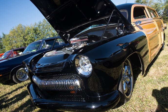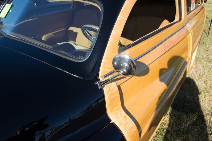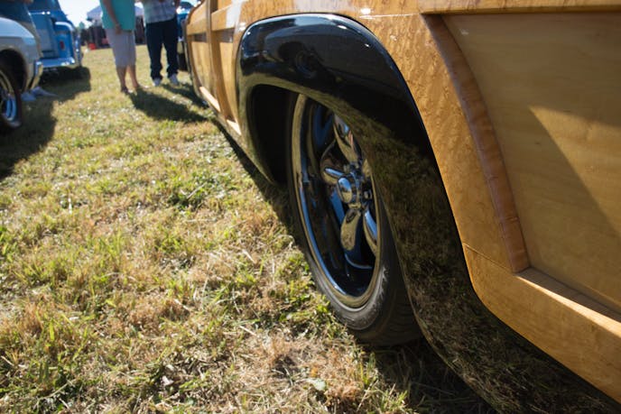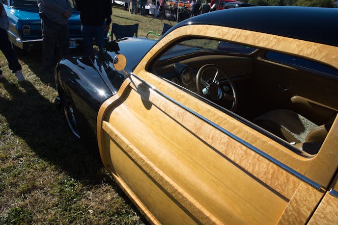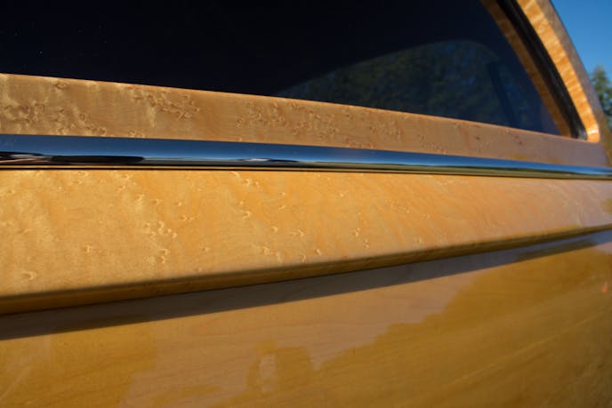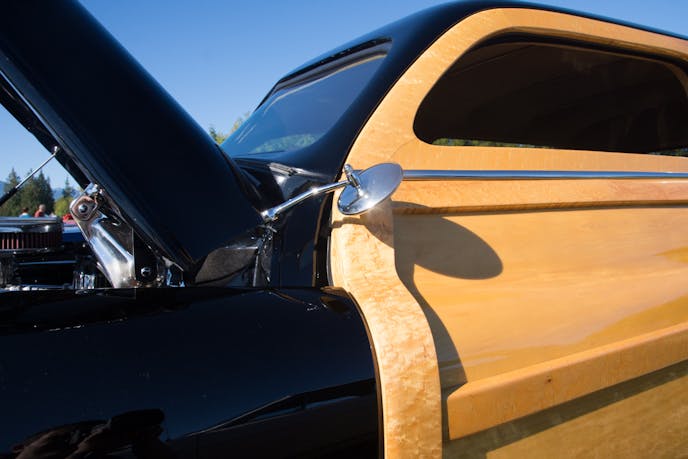 The hood mechanism is another thing that we thought was pretty interesting. He used the struts off of an old caprice for the hydraulic cylinders. That heavy hood needed some extra lifting power to keep it open. He also placed the rear-view mirrors on the metal of the hood, rather than the wood of the window frame or door post. A stellar choice that keeps the wood clean and smooth and adds another custom touch to his already over-the-top Mercury build.