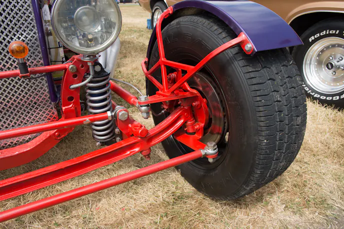 The front end is a craigslist find that came off of a 1936 Ford 1 and ½-ton pickup. “It’s a little beefier than a normal straight-axle,” Jeff explained. “The front axle is also 2-inches wider on each side so there is room for the coilovers.”