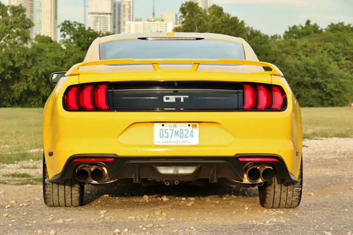 Six-piston Brembo front brakes and larger rotors help the 3,705-pound pony come to a stop quickly. Those sit behind black 19″ X 9″ front and 19″ X 9.5″ rear wheels wrapped in 255/40R19 front and 275/40R19 rear Michelin Pilot Sport 4S high-performance summer tires. Manual cars, such as my Triple Yellow press loaner, get a Torsen differential and 3.73 gearing. A performance rear wing puts the GT Performance Package’s finishing visual touch on fastback models.