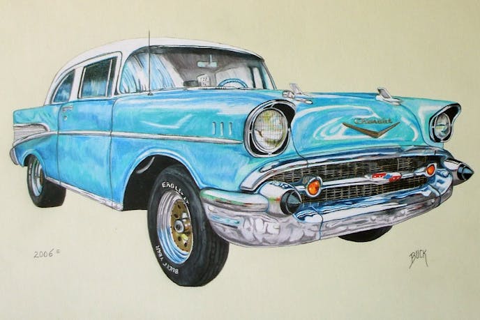 Buck: The most difficult piece I have created was probably 9 years ago. It was a drawing for a customer that had to sell his ride because of the recession. It had hit him hard, so he made a deal with his wife; He sells the car and gets to have me do a rendering of it. I was honored.