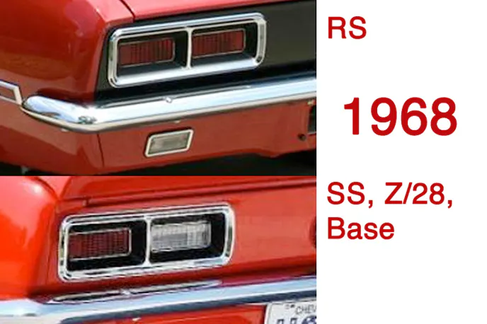 In 1968, the RS model will have a two-part red taillamp with a rectangular backup lamp below the bumper. The Base/Sport Coupe, SS, and Z/28 models will have separate taillamps and backup lamps within the same rear lamp housing.