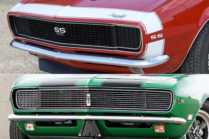 The easiest model to distinguish from the front for all three years is the Rally Sport (RS) which is sometimes combined with the Super Sport (SS) trim or Z/28 package. The RS is easily identified because of the hidden headlamps. The 1967 and 1968 models are very similar to each other, but the grille itself will help identify them.
