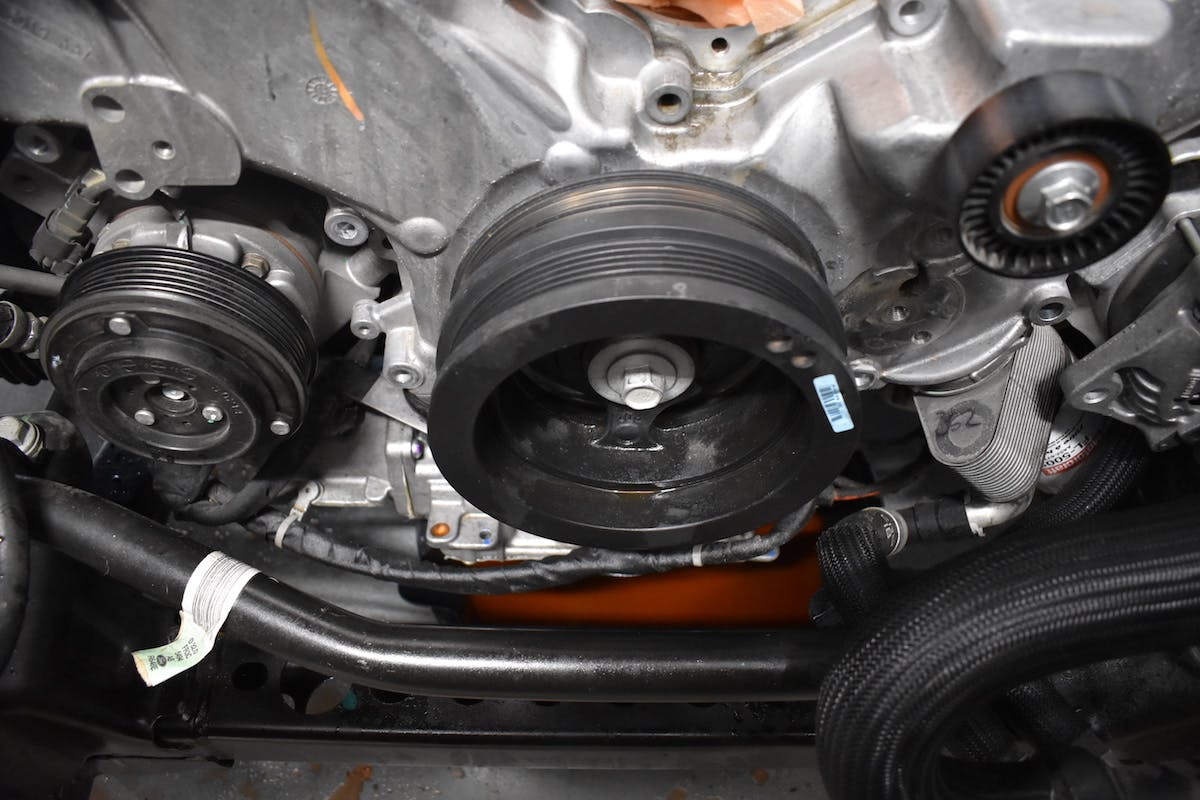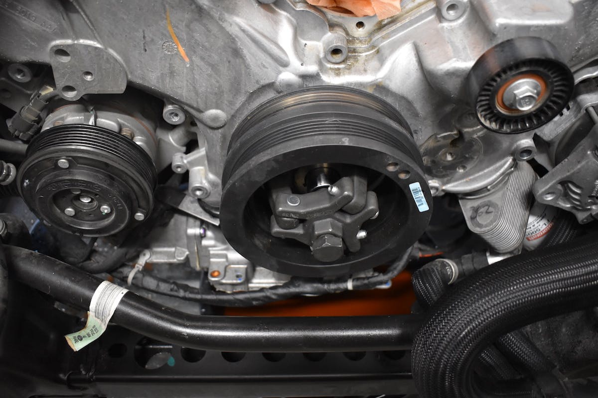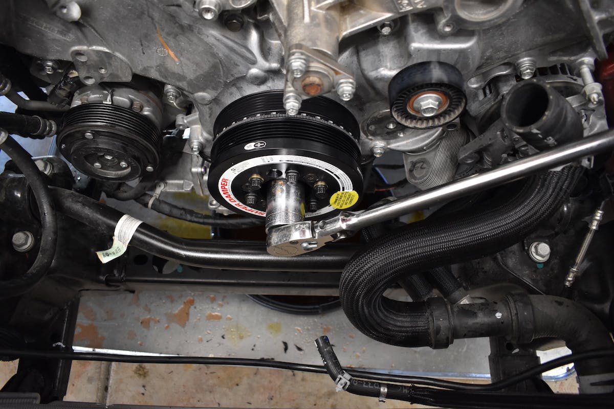 The front bumper does not need to be remove to perform this install. We had the bumper off for other reasons. This job can be done with basic hand tools and a trusted 3 prong balancer puller and a long reach harmonic balancer installation tool.