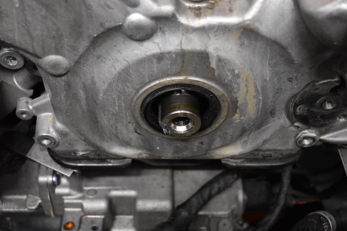 10. Using an electric or air impact remove the factory damper bolt. Make sure to remove the large washer behind the bolt.