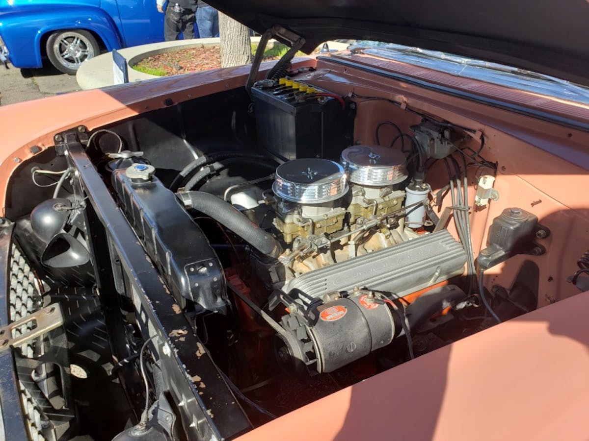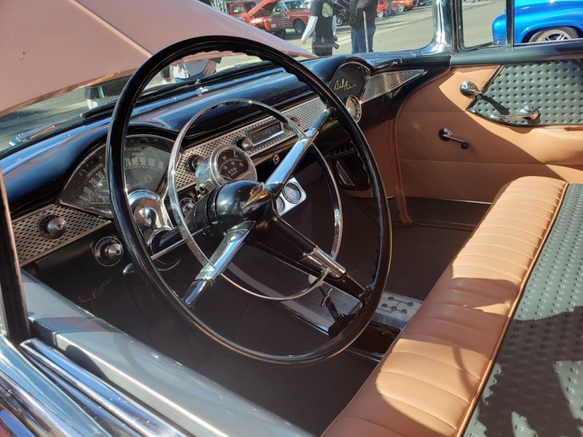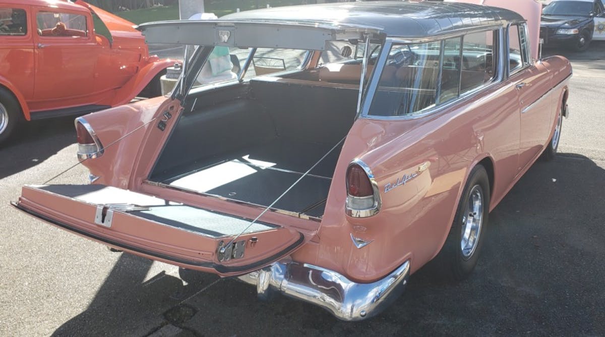 The weather was iffy in Sacramento that weekend, so there was a low turnout for the outdoor portion of the show, but we did spot a very straight, 1955 Nomad in a tropical, mid-century moderne color combo of Coral and Gray.