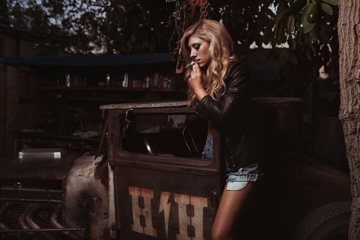 Izzie puts on a fine display in this moody scene, made complete by a rustic Deuce Coupe.