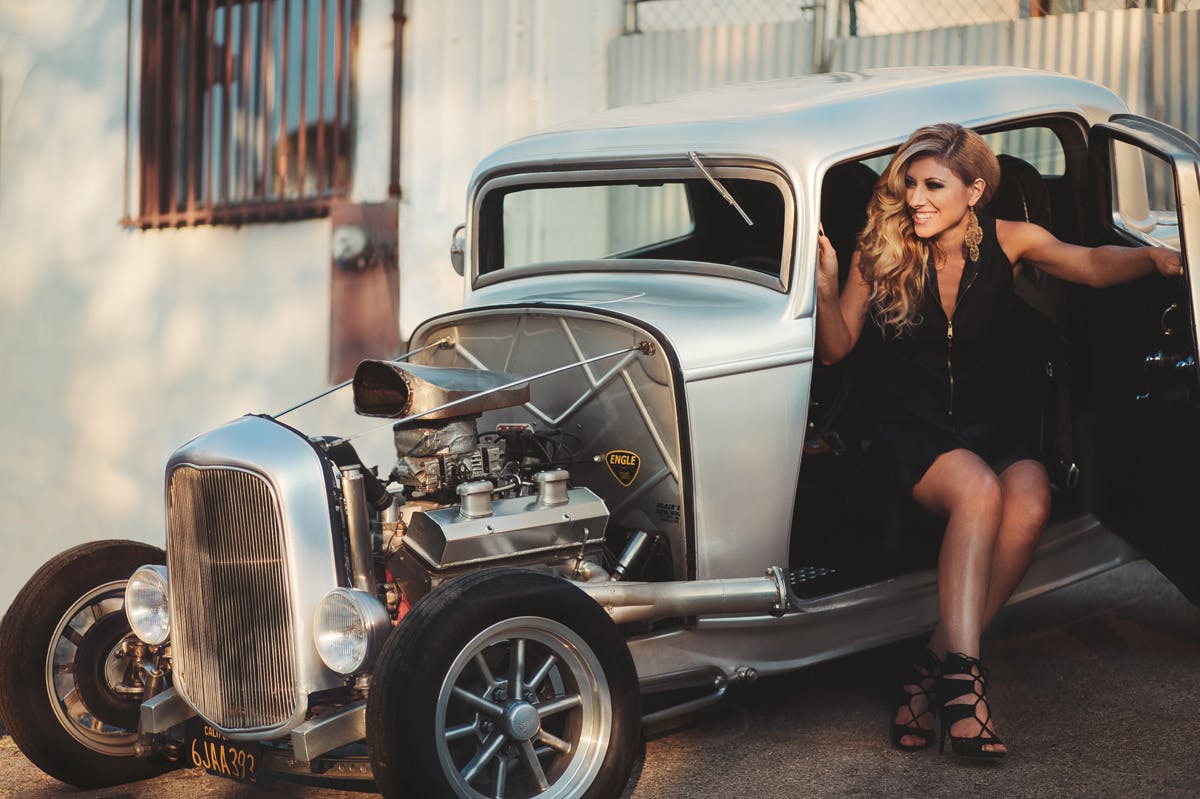 Izzie gets comfortable with this glimmering '32 Ford, owned by Echo Tescler of Silver Lake in LA. With its beautiful metalwork and 450 hp Chevy V8, it's no wonder Miss Merey feels so connected with the hot rod.