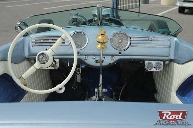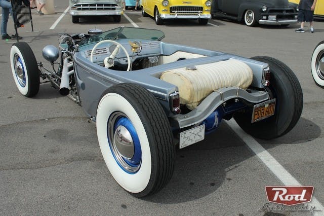 The taillights are off of a ’52 Chevy and the dash was sourced from a ’42-’48 Chevy that was shortened in order to mount it flush within the roadster. The front-end came off a ’42-’48 Ford and features a dropped-axle. Front and rear suspension is a wishbone setup. The steering wheel is off a ’40 Ford.