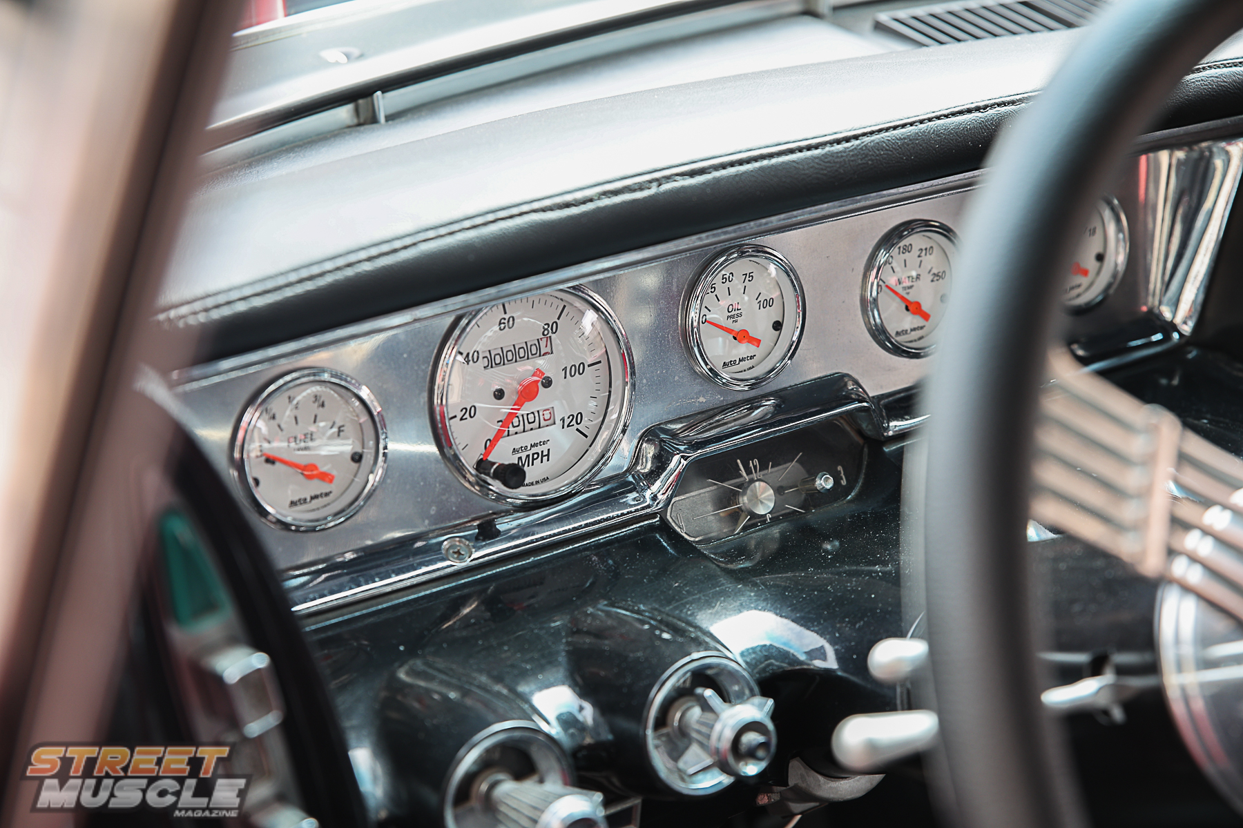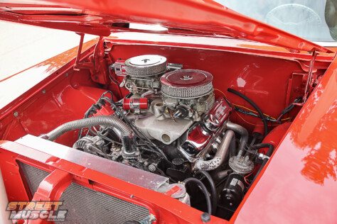 Inside the cabin, it’s another deft mix of old and new. The old gauge cluster is gone and replaced with a hand-made aluminum panel and AutoMeter gauges. The old pushbutton transmission selector was mothballed and Randy added a floor-mounted console and B&M shifter. Lastly, the interior was stitched up in red and black vinyl by a craftsman from the nearby Amish community. The result is a new take on an old idea and is a no-nonsense cockpit to pilot this big bird.