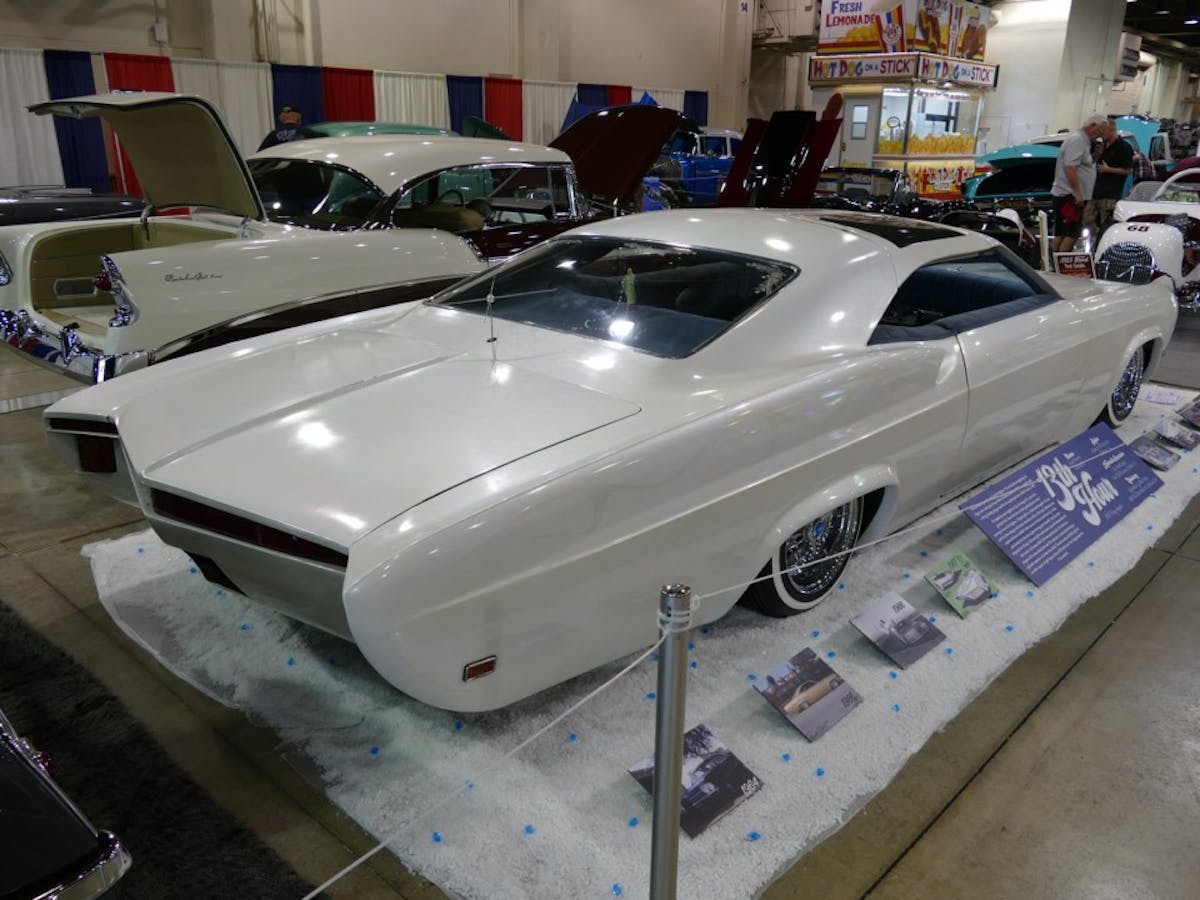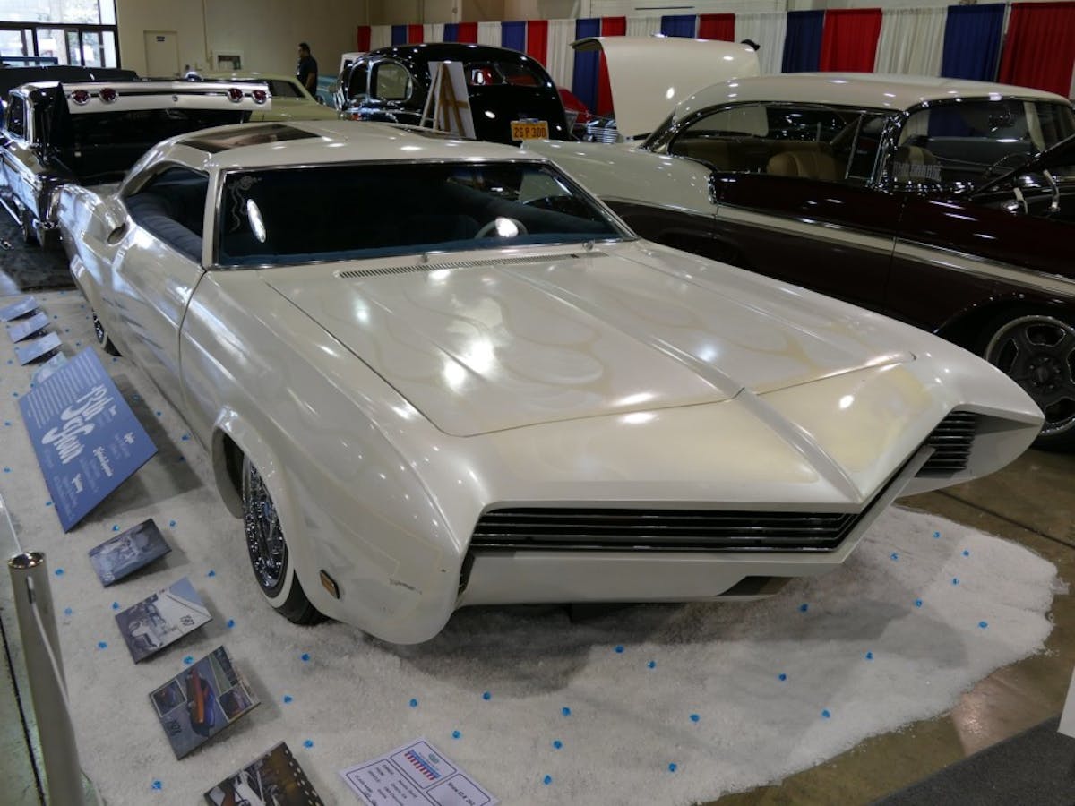 It was holding court indoors at the Grand National Roadster Show and caused quite the commotion. When I first saw it, I thought it was a 1966 Riviera, but after closer inspection, it was indeed a trusty full-size Chevy. Heavily chopped and re-styled front and rear, it is the realization of a Harry Bradley (of Hot Wheels fame) sketch that Huffman brought to life back in the day. It also has a heavy dose of Mach 5 influence in the front fender peaks as well.