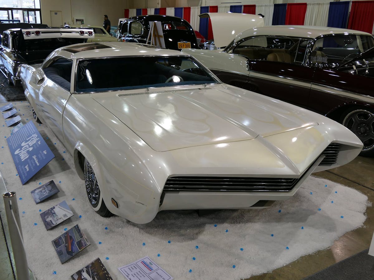 It was holding court indoors at the Grand National Roadster Show and caused quite the commotion. When I first saw it, I thought it was a 1966 Riviera, but after closer inspection, it was indeed a trusty full-size Chevy. Heavily chopped and re-styled front and rear, it is the realization of a Harry Bradley (of Hot Wheels fame) sketch that Huffman brought to life back in the day. It also has a heavy dose of Mach 5 influence in the front fender peaks as well.