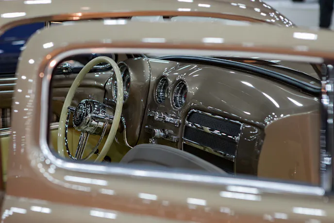 The dash is filled with Classic Instruments gauges and carries the PPG Tonic Brown and Ginger Beer paint scheme the exterior wears.