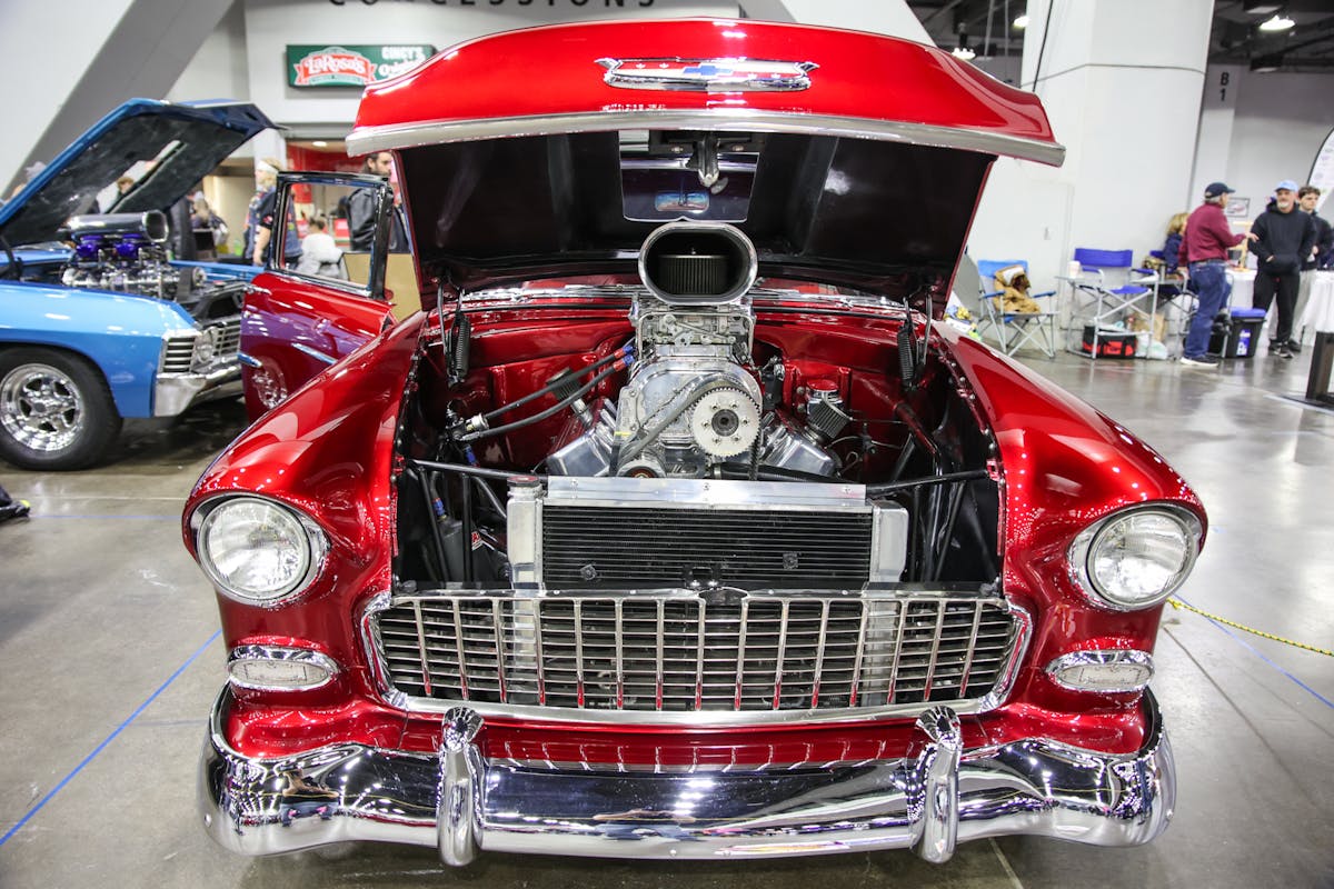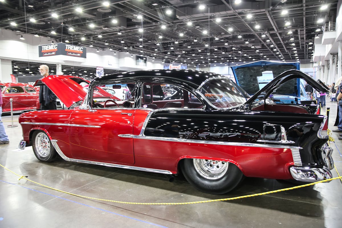 While many of us can flex our wrenching skills at the local car shows, whether we are skilled at brakes and suspension, engines and transmissions, or even fabrication; few can say they do their own paint and bodywork on their projects. Chris Dalton is one of those talented few. He knew he wanted to do a red interior in a classic 1955-style with some tasteful touches. He also wanted the classic red and black paintwork to match that theme. The black is an off-the-shelf, glossy Tuxedo Black, but the red is Chris’s own concoction. It’s a deep candy red he mixed himself until the hue was just right and then blended with a total of 32 grams of pearl to really set it off against the Tuxedo Black.