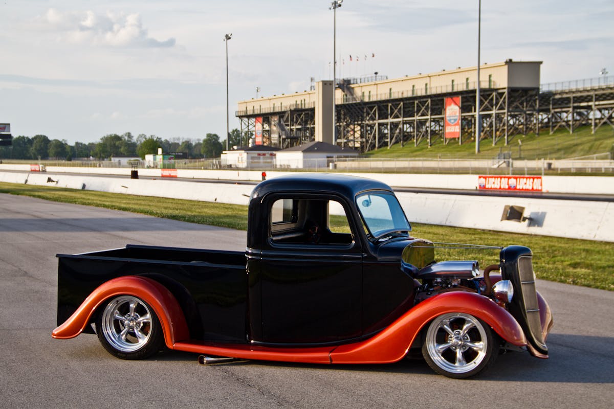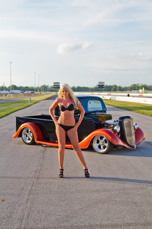 While covering the 12th Annual Slamology Automotive and Music Festival, at the Lucas Oil Raceway in Indianapolis, Indiana, we ran across this custom 1935 Ford street rod pickup, owned by Shawn Gillahan of Louisville, Kentucky. Since it was the end of the day, the sun was sitting just right on the kustom truck. After a quick chat with Gillahan and his friends, we set up a shoot on the return track where the NHRA U.S. Nationals is held annually.