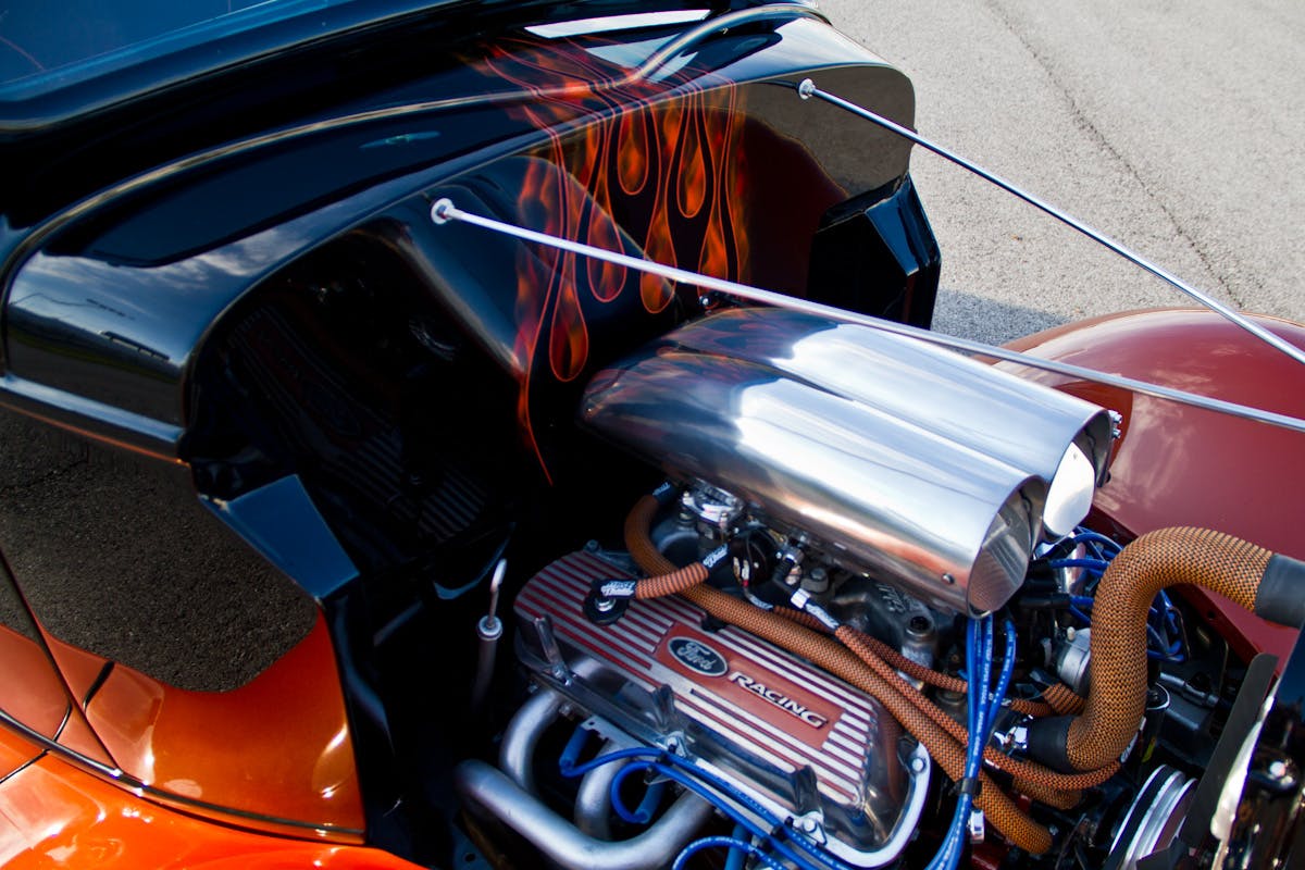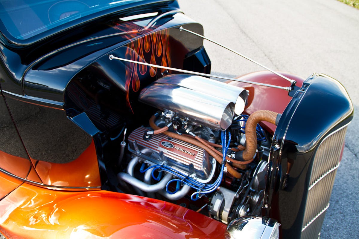 With the frame and suspension work wrapped up, it was time to focus on the engine. Shawn came up with a 1968 Ford Mustang 289ci small block engine with a mild cam, and bored .40 over, producing approximately 300hp. Adding to the performance upgrades is a blower, custom hoses, and an aluminum radiator.