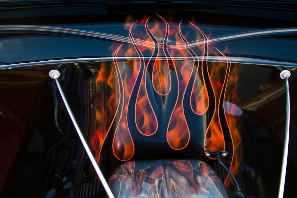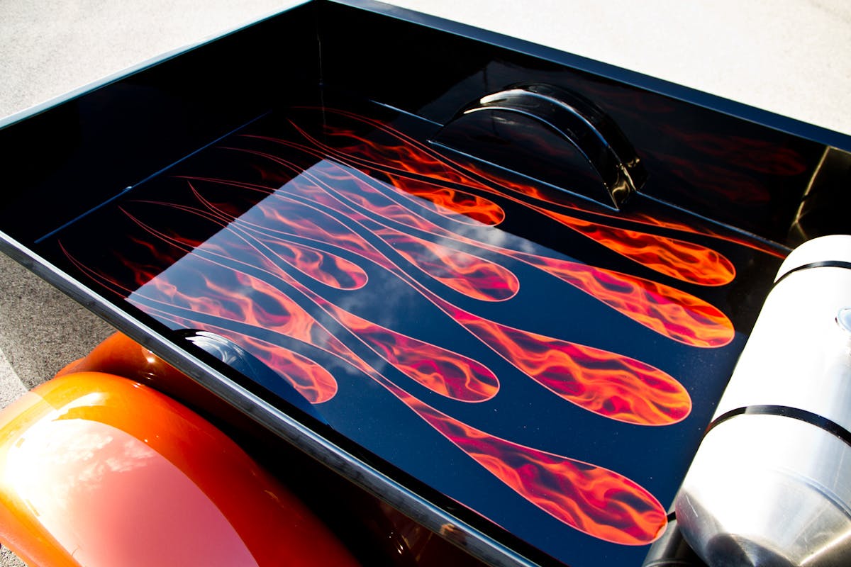 After all of the sanding and smoothing of the sheet metal was complete, Shawn’s friend, Kent Hansford, sprayed the truck’s body with PPG Black and a custom mix of Burnt Orange. Next, Kent laid down flames on the smoothed firewall, tailgate, as well as inside. After the paint dried, the body was wet sanded, and waxed to a brilliant show car shine.