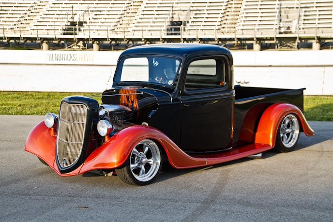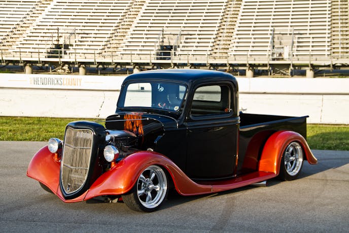 While covering the 12th Annual Slamology Automotive and Music Festival, at the Lucas Oil Raceway in Indianapolis, Indiana, we ran across this custom 1935 Ford street rod pickup, owned by Shawn Gillahan of Louisville, Kentucky. Since it was the end of the day, the sun was sitting just right on the kustom truck. After a quick chat with Gillahan and his friends, we set up a shoot on the return track where the NHRA U.S. Nationals is held annually.