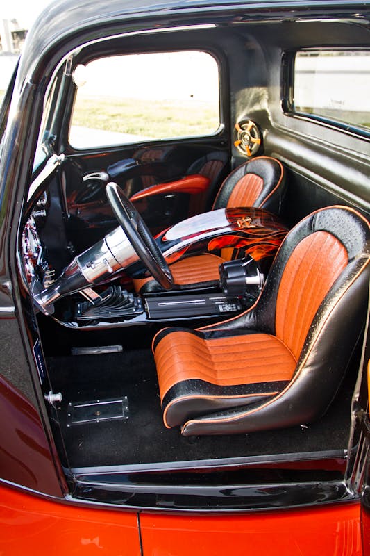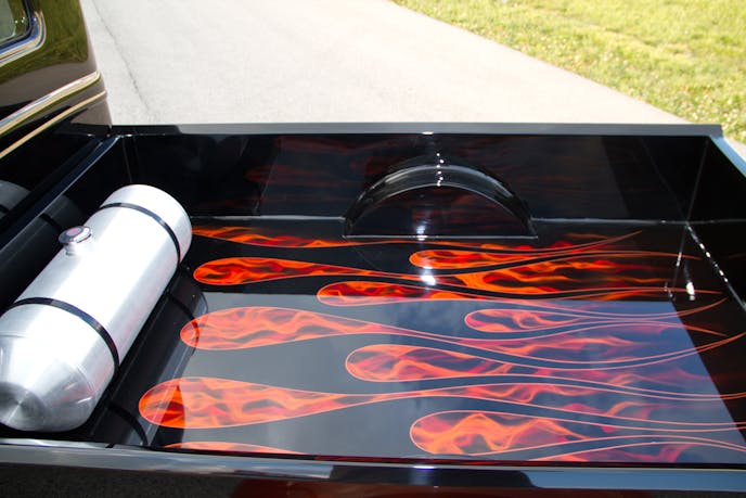 After all of the sanding and smoothing of the sheet metal was complete, Shawn’s friend, Kent Hansford, sprayed the truck’s body with PPG Black and a custom mix of Burnt Orange. Next, Kent laid down flames on the smoothed firewall, tailgate, as well as inside. After the paint dried, the body was wet sanded, and waxed to a brilliant show car shine.