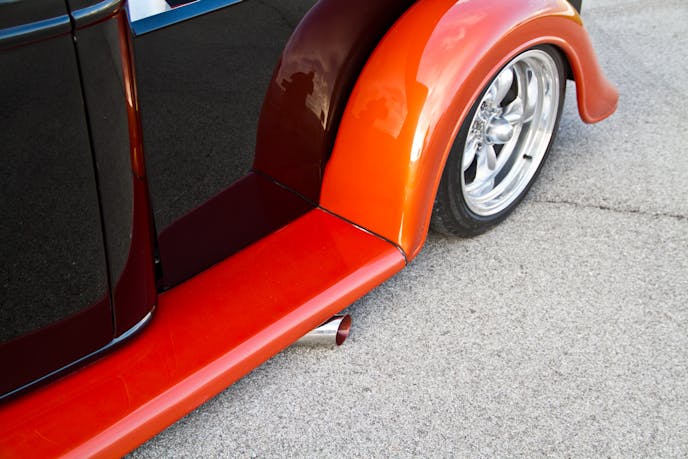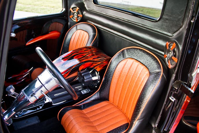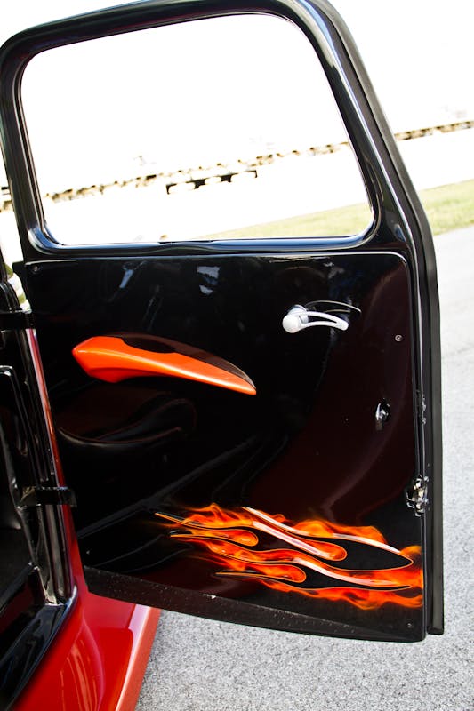 After all of the sanding and smoothing of the sheet metal was complete, Shawn’s friend, Kent Hansford, sprayed the truck’s body with PPG Black and a custom mix of Burnt Orange. Next, Kent laid down flames on the smoothed firewall, tailgate, as well as inside. After the paint dried, the body was wet sanded, and waxed to a brilliant show car shine.