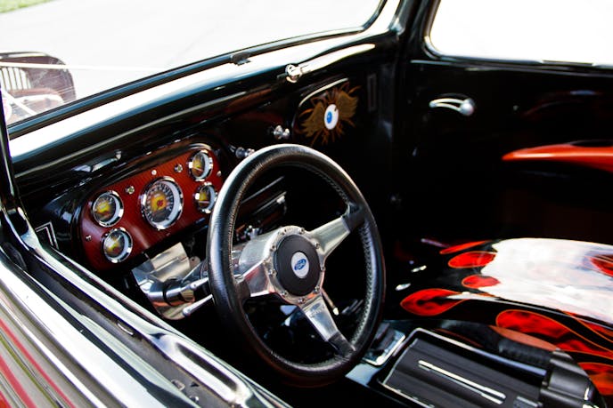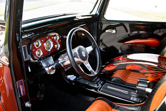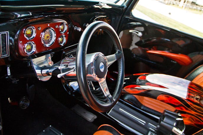 The dash was fitted with a custom set of gauges that blend well with the paint scheme. The rest of the dash was painted PPG black to match the exterior and a custom Von Dutch flying eyeball graphic was painted on the glove box.