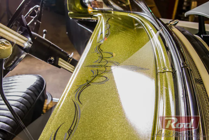“I tried to do some research before I got started,” Kevin admitted. “I watched some stuff on the internet, and then I went and talked to people who actually do it for a living. They gave me some great tips, and then, I just kind of went for it.” We think it turned out pretty amazing. The color and shine are deep. The metal flake is just enough to really turn heads. Mark Zander at Lumpy’s garage did the pinstriping.