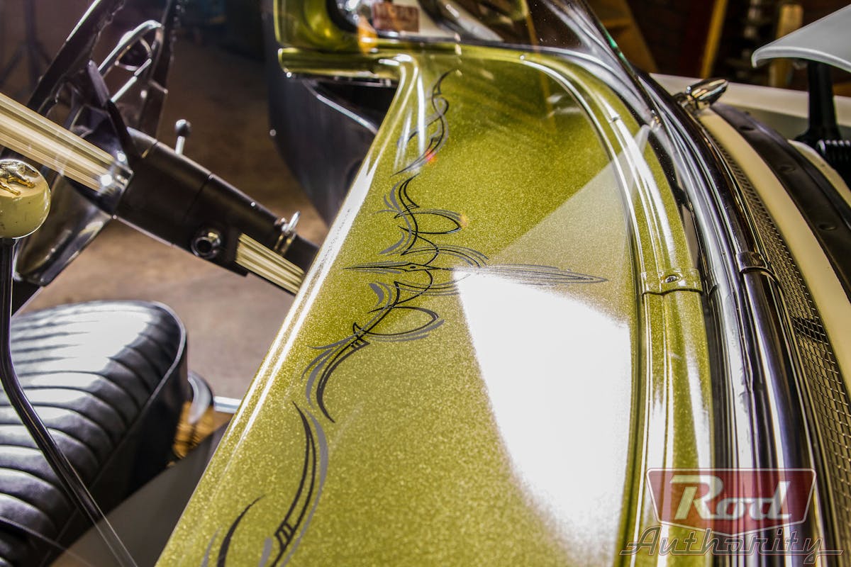 The hood of the Buick Special has been shaved and a peak added. This gave the car the look Kevin wanted and is pretty unique. The trunk lid was also shaved to keep the streamlined appearance. Even the door handles got some love. As mentioned previously, Kevin did the paint himself. It was the first time he ever sprayed a car, so it was definitely a learning experience.