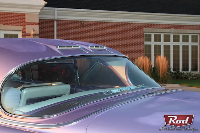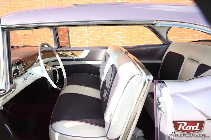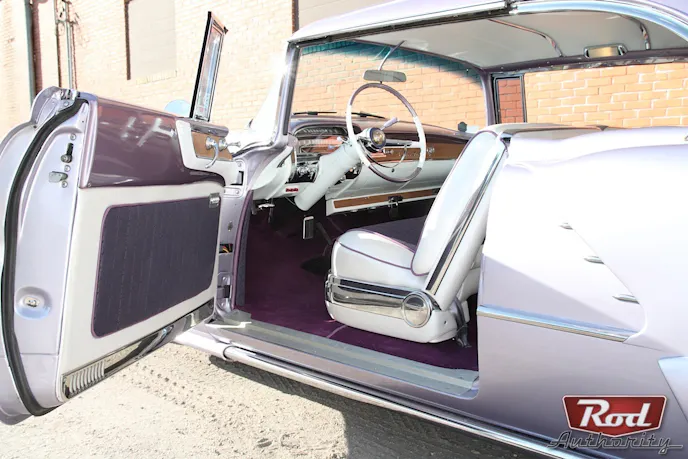With the body ‘classed’ up, the interior had to speak ‘Cadillac class’ too. A ’56 Cadillac dash was put in, a ’66 Buick tilt wheel added for those long highway cruises and a CD player was hidden in the dash. Ed Banes Interiors was then given the job of  “classing up ” the interior. Pearl White Naugahyde was chosen for the stock power front seat, rear seat, door panels, and headliner. Amethyst Swirled fabric was rolled and pleated as inserts after “Cadillac” was embroidered on the seat tops.  Plum colored carpet complements the PPG BC/CC Lollipop Lavendar paint on the body while the roof was sprayed 1955 Ford Regency Purple. Yes, it’s two-toned and subtle, and it works.