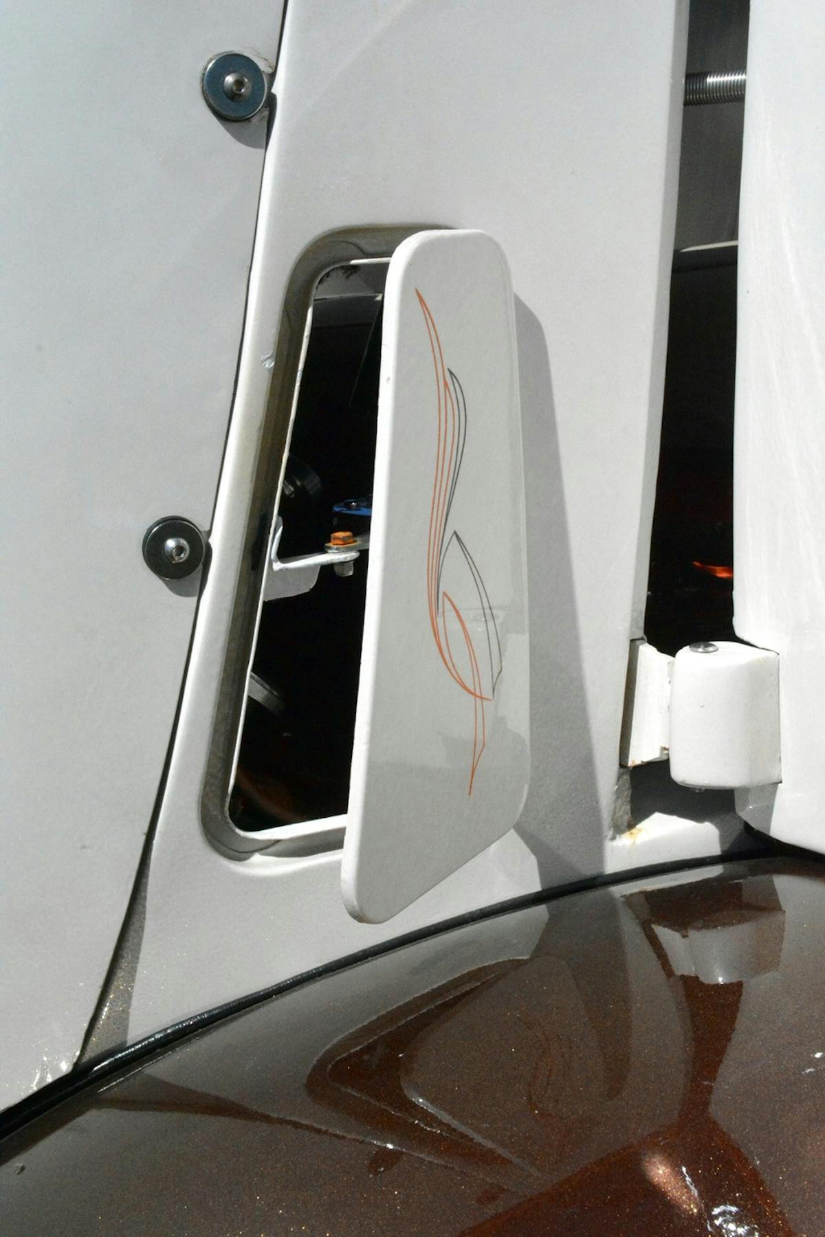 Inside, all three primary body colors are incorporated into the interior, from the Pearl White seats borrowed from a 1970 Bronco that are flanked with orange seat belts, to the Rootbeer and Cream dash and metal door panels. Topping everything off is just enough brightwork to make things such as the steering column, door handles, and the gauge cluster pop. Though Elder says he still needs a stereo for the truck, it does feature power windows as a little added bonus.