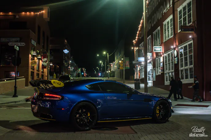 Over the last year of ownership, Constantine has added a custom satin yellow stripe to contrast with the factory cobalt blue. The roof is wrapped in gloss black, and the car has gloss black decals along the side of it as well. The front of the car features a custom made for racing, carbon fiber Vantage GT3 style hood and Vantage GT4 canards complemented with a carbon fiber GT wing in the rear.