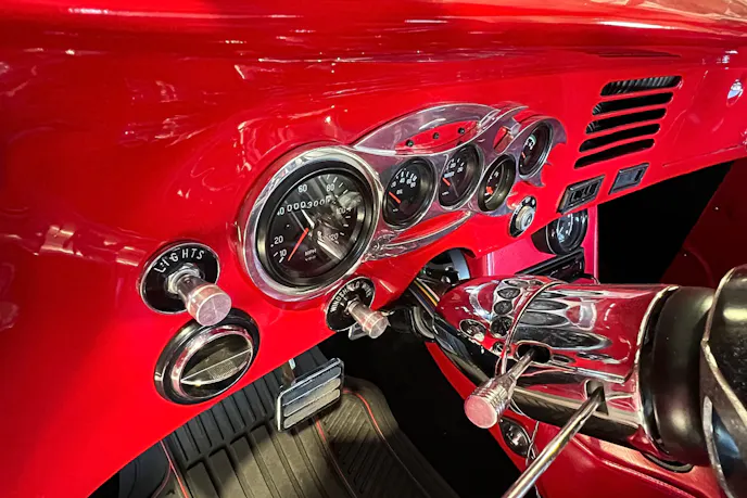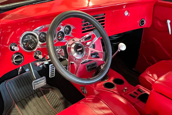 Tom Tilley, whose 440-power Dodge A100 compact pickup was featured here recently, added the back seat to the Champion. It is fully custom and looks like it was meant to be there all along. The Champion’s front buckets are recovered in bright red and are far more comfortable than the originals. It employs an ididit tilt steering column with a Grant wheel. The instruments are Auto Gages from Auto Meter. Power windows and cupholders integrated into the floor console add a touch more modernity.