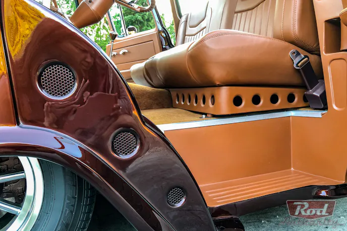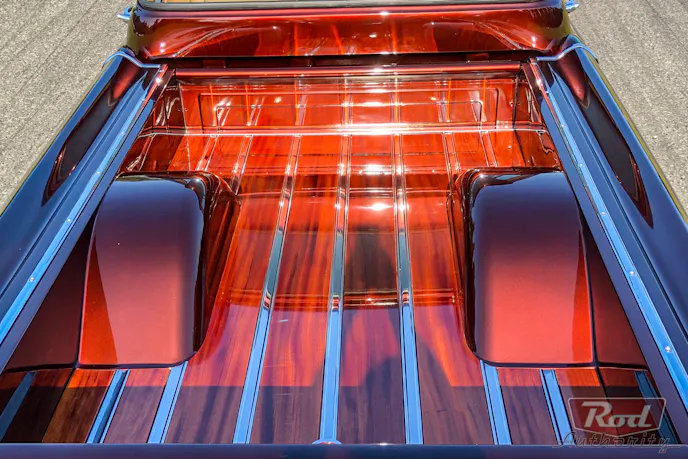The inner fender flares to cover the massive rear tires painted Rootbeer Tangerine, gleam in the sun and swim into the mahogany wood bed seamlessly. The polished runners between the wood bed pieces create an incredible canvass. No truck bed liner required here.