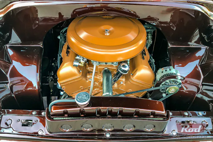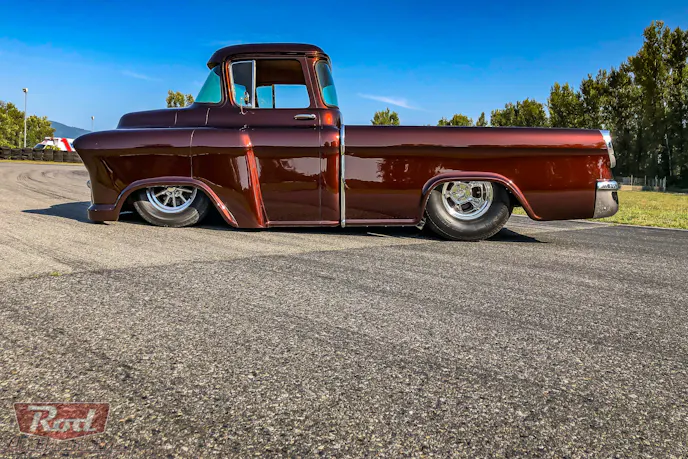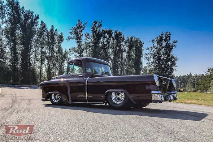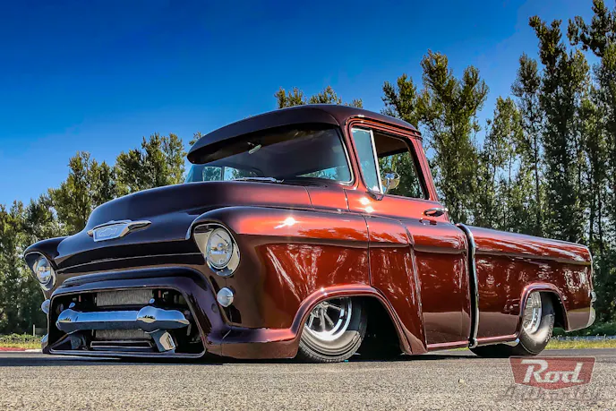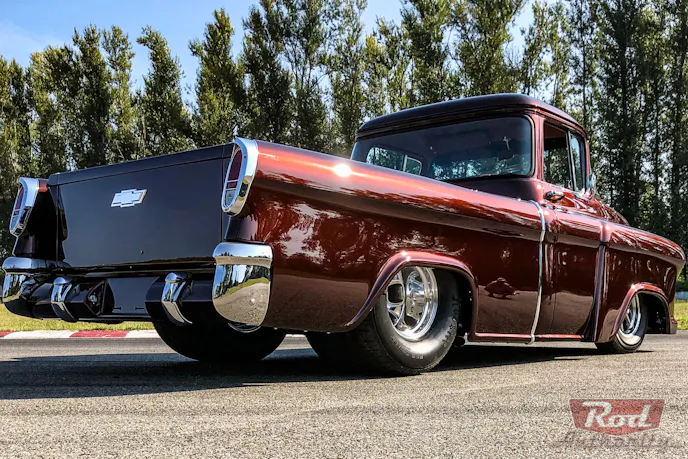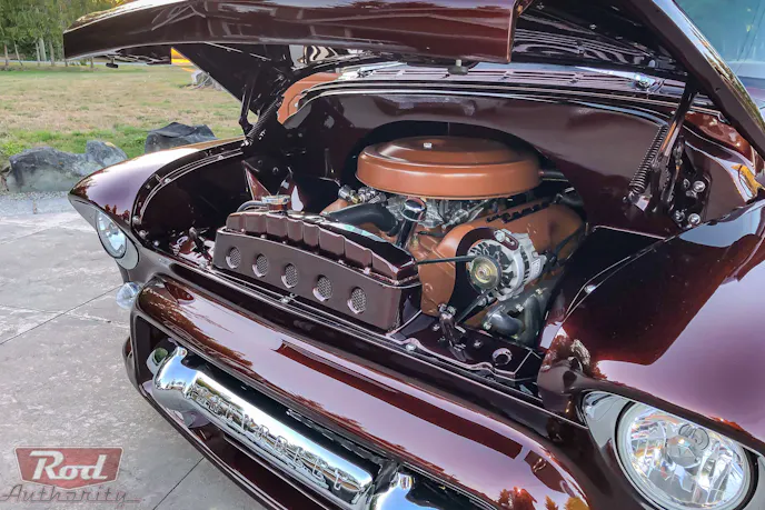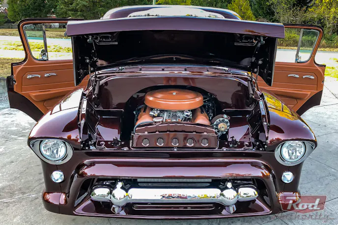 Motivation for the truck is provided ba a Chevrolet 409 built by Jack Gibbs at 409 Chevy Performance in California. Gibbs stroked the 409 to 472 cubic inches. The Edelbrock dual carbs help feed the air and fuel to a stout 510 horsepower. The custom firewall and engine compartment were smoothed to help the fitment of the 409. The paint and fabrication inside the engine compartment are clean and minimalistic. The big-block engine is bolted to a TCI Turbo 400 transmission with a 2800 stall torque converter.