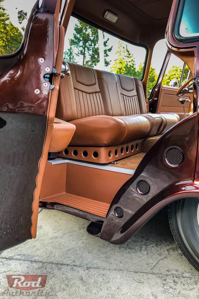 All of these body modifications are credited to Nolan Hoffman and Mark Hoffman. Additionally, custom touches to the door jams and the engine compartment contributed to the hours of bodywork and sanding. Realizing the cab lights were removed and filled in you can see the mods are endless. The paint was done by Procraft Restoration out of Duncan, British Columbia, using Custom House of Kolors, Rootbeer Tangerine. The multiple coats of paint and endless sanding gives this truck a show quality and finish that is so deep it looks like you can dip your fingers into it.