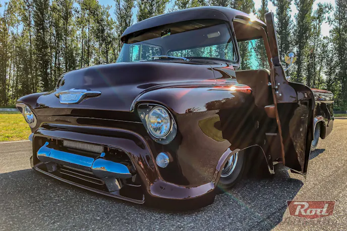 We’ve all spent plenty of time at car shows, standing in the sun, staring at another customized ’55 Chevy 210 Sedan. Don’t get us wrong, 210s are cool. But, how many times have you been at show-and-shine and stood next to a customized 1955 Chevy Snub Nose Cab Over Cameo? Never? Well, if you happen to be in Nanaimo, British Columbia, Canada, you might find yourself standing in front of Darren Hoffman’s “Tug Boat” or (“Lil’ Tug” depending on the day,) an insane 1955 Chevy Snub Nose pickup. Every inch of this truck has been modified.