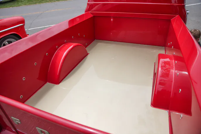 The simplicity is part of the beauty of this old truck. The stance is outstanding, the red paint stands out and the gold spears down the hood and front end really set it off.
