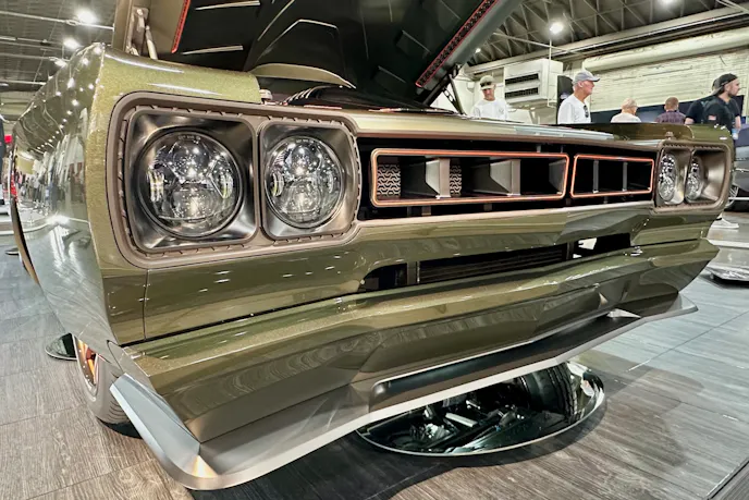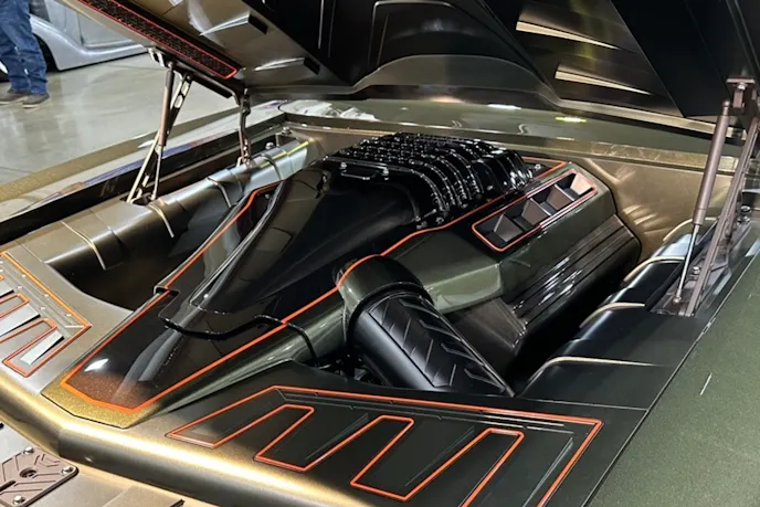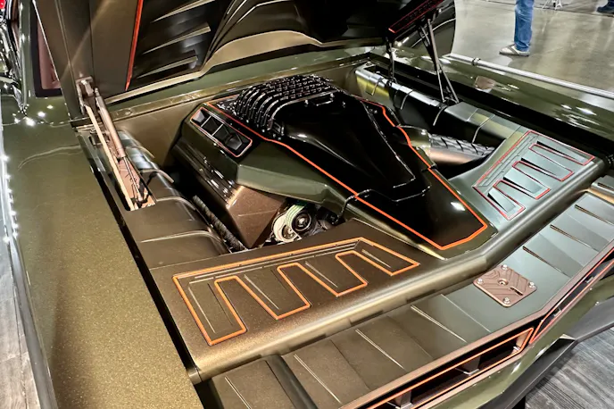 The build team started from the ground up at the floor and subframe, raising the wheelwells and laying a foundation that could handle the Herculean power of the Hellephant. Flush-mount glass and custom drip rails upped the Roidrunner’s sleek scale, while the rear was reworked for custom exhaust tips. A hidden rollbar was integrated into the cabin. The team also fabricated front air dams, a rear spoiler, and a gauge bezel for the Dakota Digitals. A CNC’d grille and taillights with a hidden fuel filler were added to the list of shop-made adds.