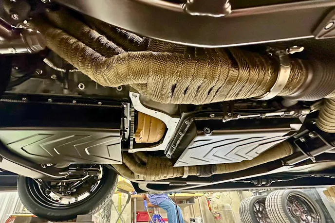 ”A lot gets covered up when doors and hoods close, but you can see that chevron on the engine bay, the bottom of the hood, engraved in the interior, in the floorboards — throughout the whole car. If you look underneath, you will even see a custom oil pan and a custom transmission pan with that pattern.“