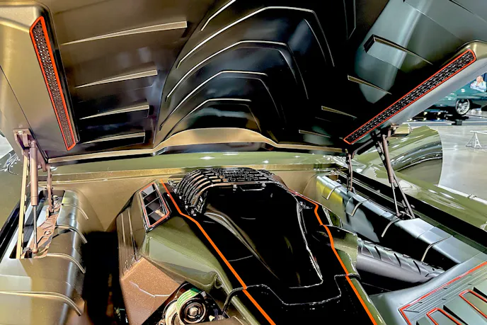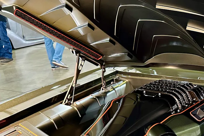 The engine bay was crafted into an artfully-designed centerpiece, incorporating a full multi-piece engine cover with CNC’d valve cover vents and a custom-fabbed firewall. Adding to the list of Easter eggs are discreet access points that allow cover removal for service and fluid refills.