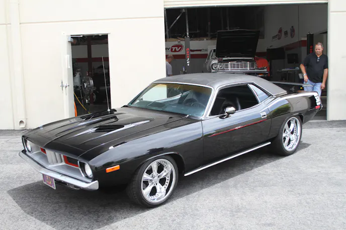 interesting sight at night. He added a reproduction deck lid spoiler from an earlier ‘Cuda, and you can’t miss the chrome Foose-design wheels. The staggered wheels are 18 x 8 in the front and 20 x 10 in the rear, with 235/40R 18 and 275/40R 20 tires.