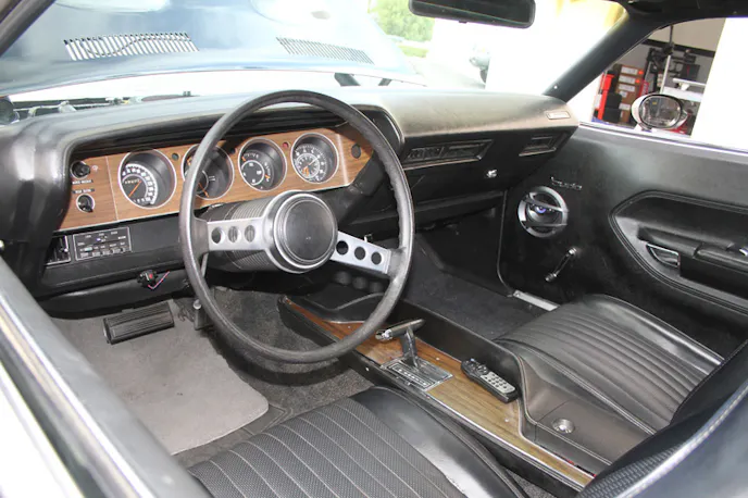 Under the hood, the original 340 had some problems, so it was taken out and replaced with a stroked 360. The 4 inch Mopar stroker crank brings it to 402 cubes, and with a set of TTI headers and exhaust system the ‘Cuda sounds about as healthy as it looks. He’s also had the transmission beefed up with a shift kit, magnesium flywheel and a 3500 stall converter.