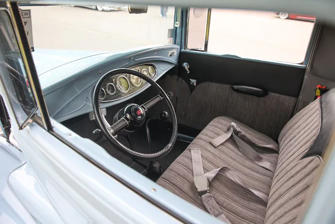 Inside, he skipped the usual route of retro-style or reproduction parts. Instead, he focused on comfort. The seat, pulled from a Chrysler minivan, might raise a few eyebrows, but it fits the theme perfectly. It’s comfortable and practical and fits the truck’s proportions well. The dashboard is styled after a 1932 Ford, giving it the look of a more polished hot rod interior, while the steering wheel is from 1944. It all ties together with an aftermarket Speedway Motors steering column, creating an ergonomic driving position without losing the vintage vibe.