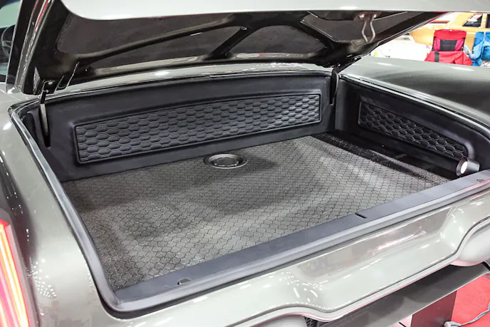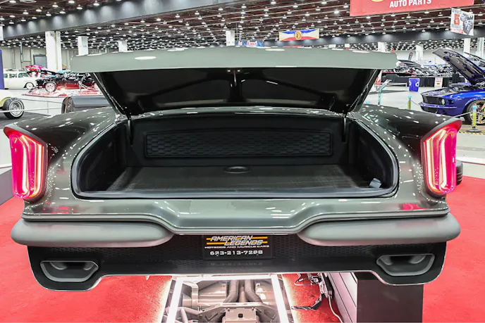 The owner’s favorite part? The rear of the car. The way the long trunk flows into the tailfins and extended taillights and wide rear glass captures everything he set out to do. It’s a bold design that stretches nearly to the pavement-and it looks right at home there.