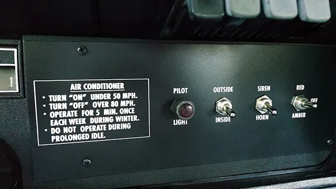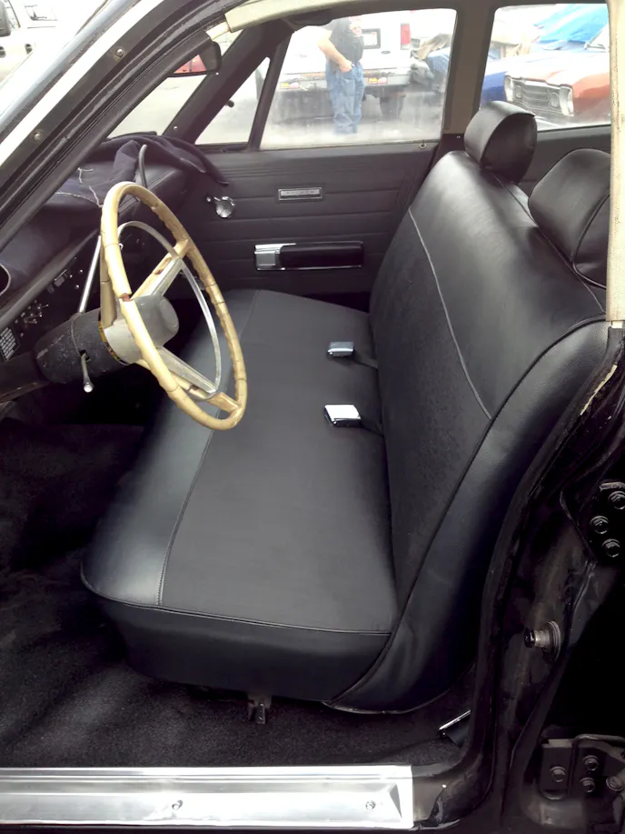 The interior was meticulously restored, including the CHP cars’ unique pearl white steering wheel (intended to cut down on burned fingers owing to the California heat), factory air-conditioning, and manual steering. The bench seats were covered in the original heavy-duty vinyl and cloth.
