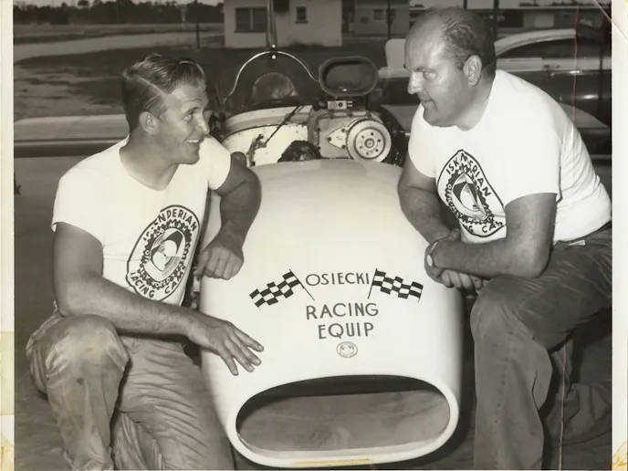 Bob and Art before the record setting run. Photo from {link=https://www.hotrodhotline.com/feature/heroes/landspeedracing/2010/10newsletter155/}www.hotrodhotline.com{/link}